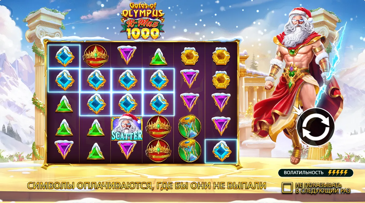 Impressions of the game: Visually, the slot looks fresh — Zeus in a Santa Claus costume looks amusing, and snowy Olympus creates a festive atmosphere. The gameplay remains just as exciting thanks to the cascading payouts system and cumulative multipliers in the bonus.
